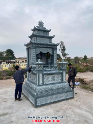 Đây là thiết kế có quy mô hoành tráng, kích thước lớn, các hoa văn trên này cũng được trạm khắc tinh xảo và tỉ mỉ. Vì vậy mà giá thành cũng cao nhất trong các mẫu lăng mộ có mái. Đặc điểm nhận diện là phần ba mái đao, được lắp đặt tính toán chính xác, thiết kế này luôn tạo cho người nhìn về độ hoành tráng và đầu tư trong mỗi chi tiết.
